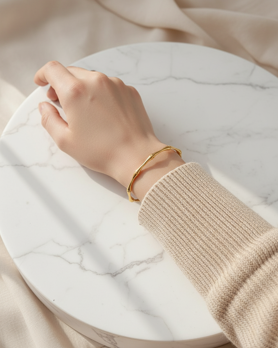 Embrace a chic and trendy look with this 18K gold-plated minimalist bamboo cuff bracelet. Crafted from brass, this fashionable cuff features a geometric design that adds a modern touch to any outfit. Perfect for women, this bracelet is ideal for layering or wearing alone.